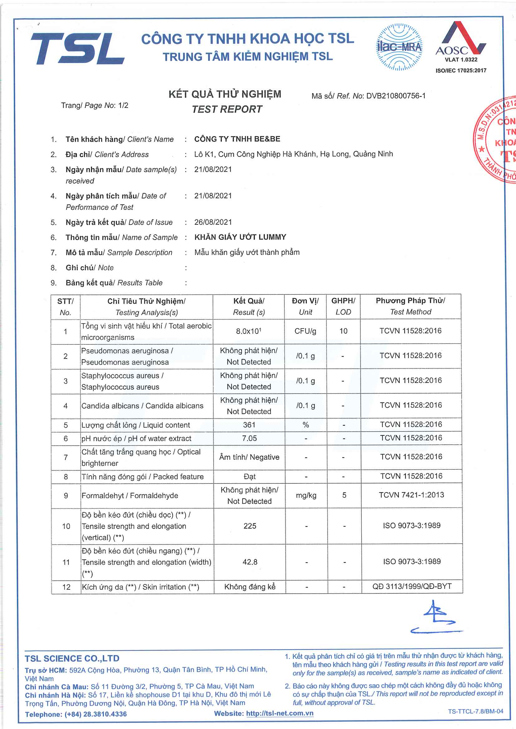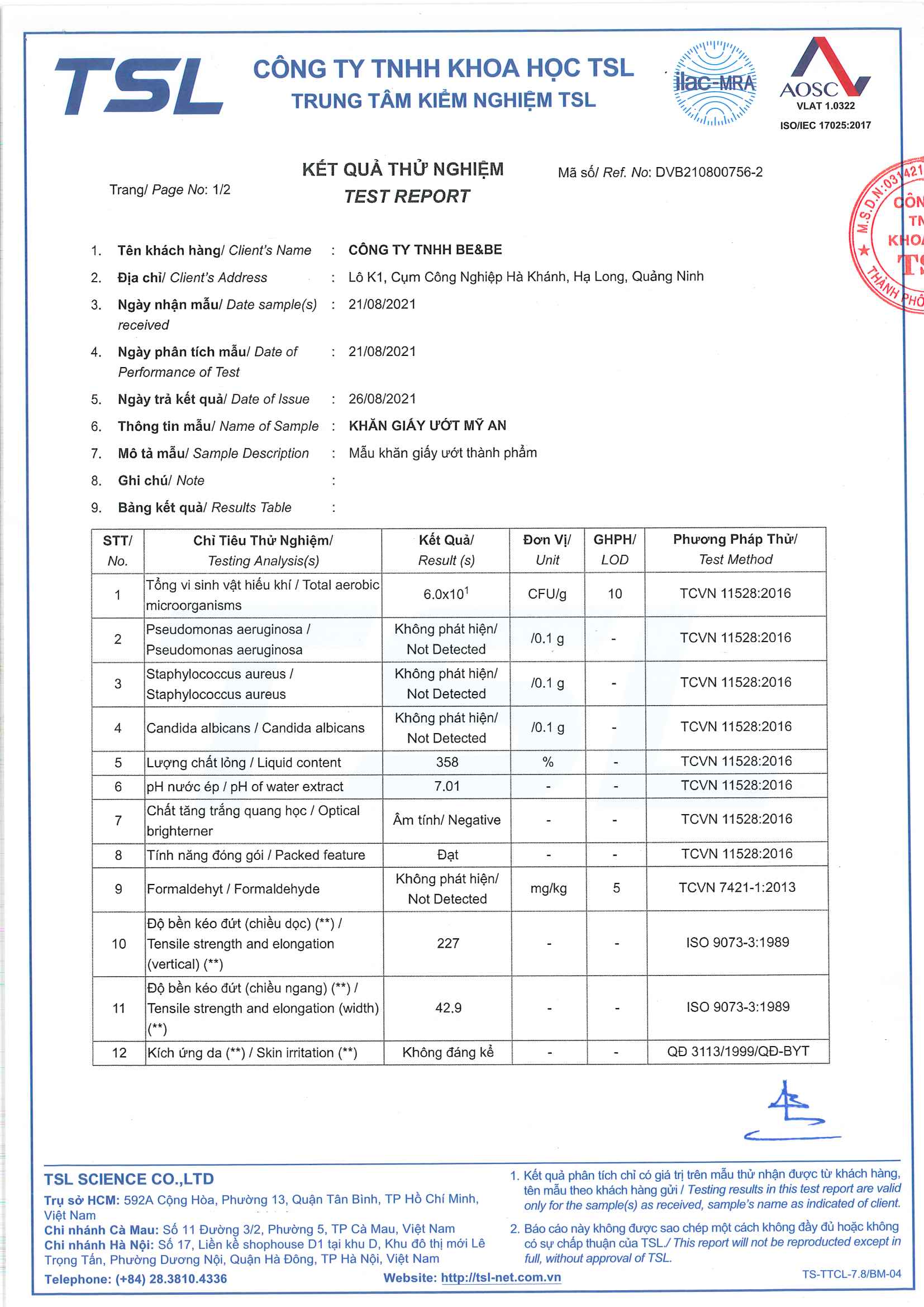 – Sản phẩm đạt 12/12 các tiêu chí trong Tiêu chuẩn quốc gia về khăn giấy ướt ( TCVN 11528: 2016),